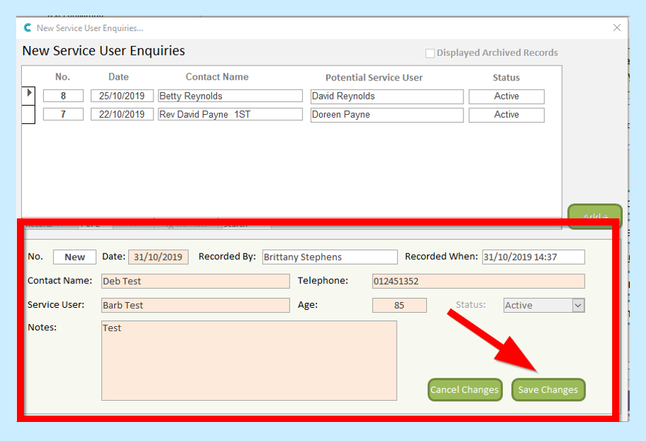 You will then be able to enter information about your new enquiry. When you have entered this information select Save Changes.