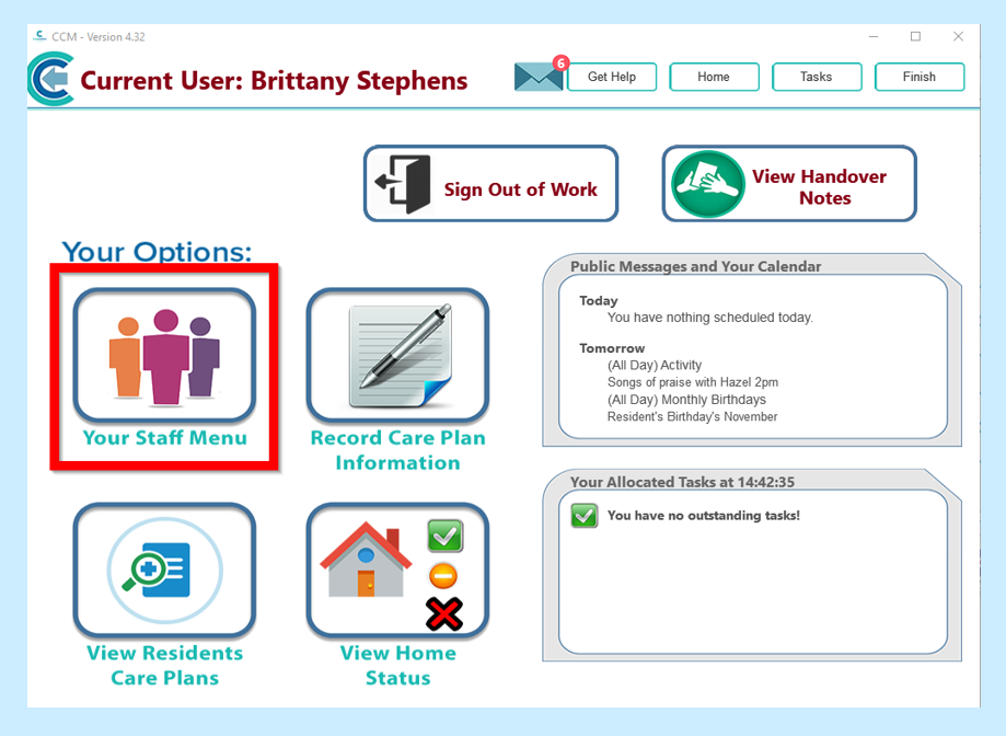 Once you have logged into Care Control Mobile you will need to go to the Staff Menu.