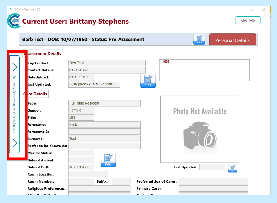 Once you have completed as much information as you can on this page, select the Access Assessment Sections tab on the left hand side of the screen.