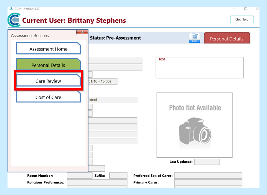 When you have gone through all the Care Review domains and entered the information, you will then be returned to the Personal Details page.