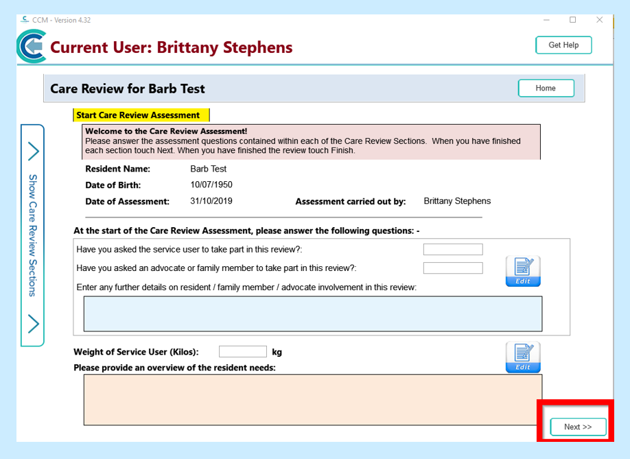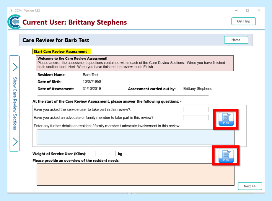 You will then be able to complete the Care Review Assessment. You will need to select the Edit boxes and enter your information.