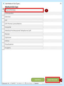 Type in the name for the new medical visitor, i.e. Physiotherapy and select Save Records.