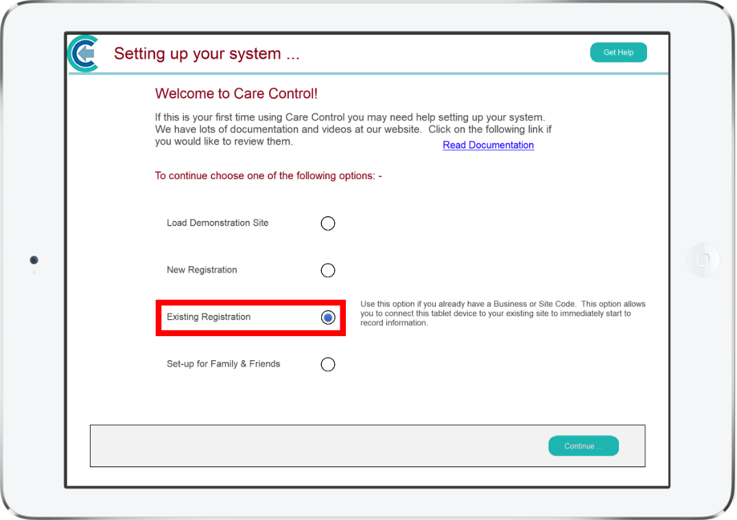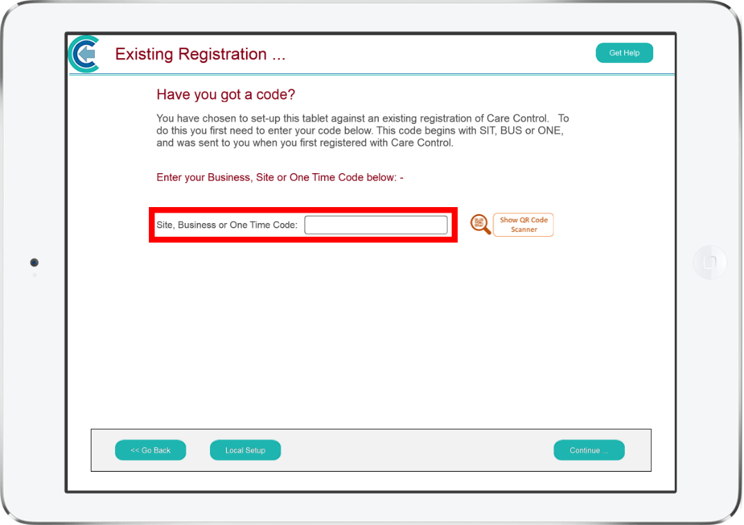 To register with a One Time Code, click on Existing Registration.