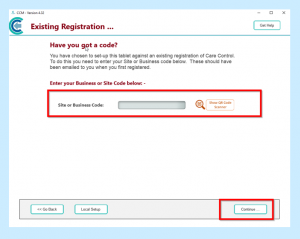 Enter your Site Code for a staff tablet or the Business Code if you have more than one site that you want to see.