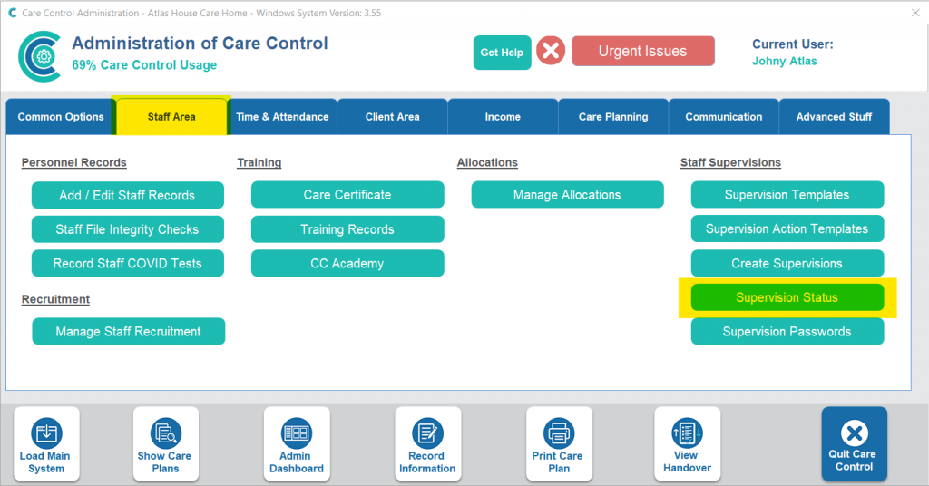 In the Administration of Care Control Windows, select Supervision Status under the Staff Area tab.