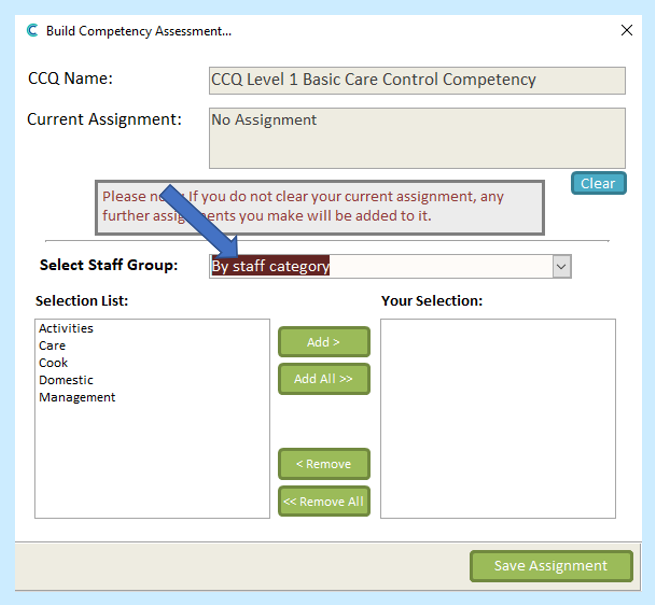 To assign, click on the name of the category (e.g. Care), once it is highlighted in black, select Add.