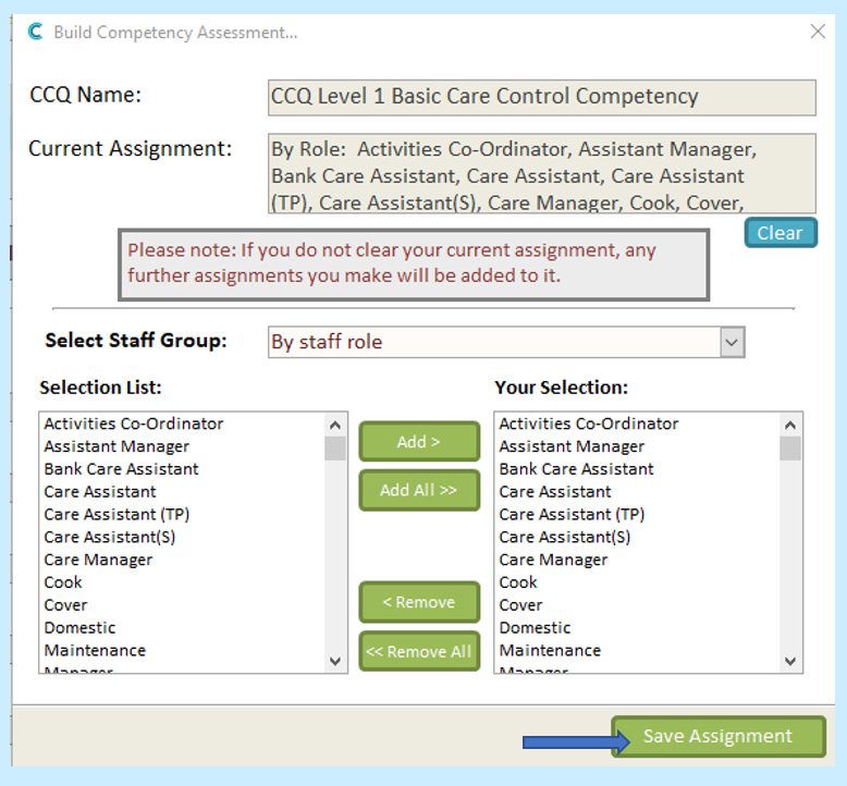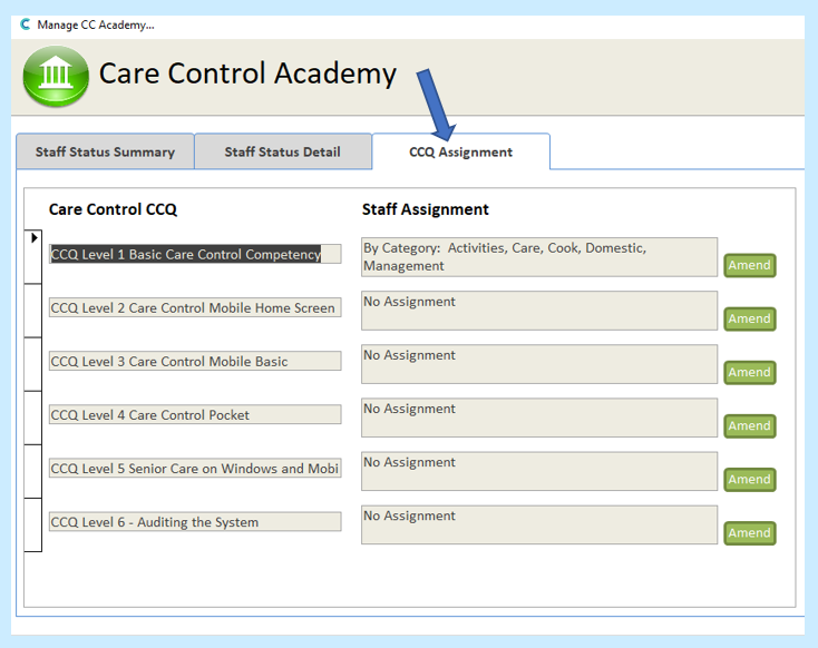 Select Amend next to the CCQ Level you would like to assign. You can then assign By staff category, By staff role or By staff member.