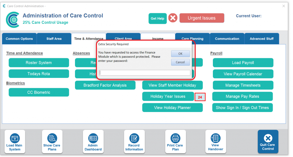 To get to the Invoice Lines section, go to Full Admin and click on the Income tab. You will need to enter the finance area password to continue.