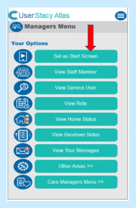 When on the Menu, select the first option – Set as Start Screen. You will then be asked if the device is a secure device. Select Yes. Care Control Pocket will now restart and open in the Managers Menu.