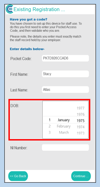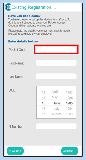 You will then be sent to the Staff Registration page. To enter your Pocket code, click on the text box.