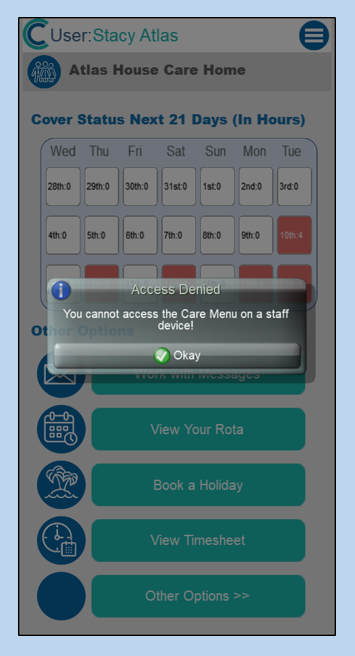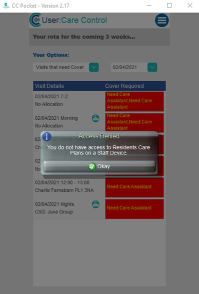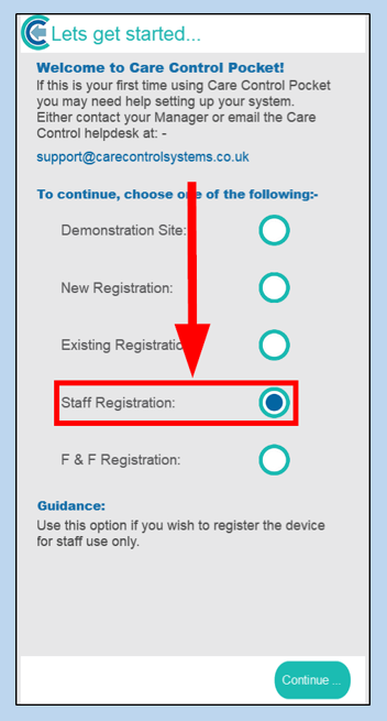 If your staff are installing the Care Control Pocket app onto a personal device, it may be wise to use the Staff Registration option. This will allow them access to their rota, timesheet and messages without allowing access to care plans.