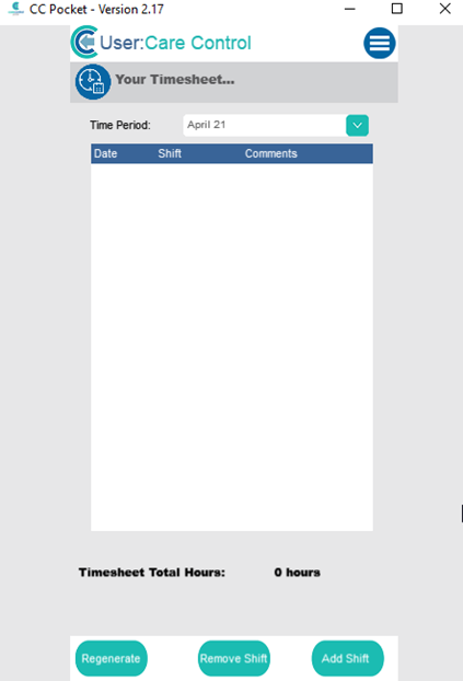 It will automatically produce a timesheet based on the hours on your rota. To add any additional hours click Add Shift. If a shift has not been covered then you will need to click Remove Shift. If you need to change a shift you will need to do both, click Remove the Shift, and then add it back on – this is important if you have completed extra hours.