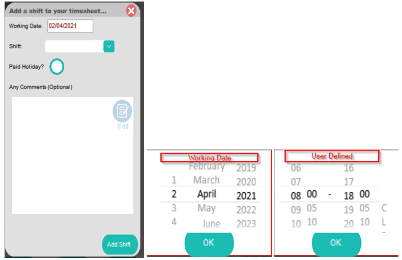To add a shift click Add Shift and the date will automatically populate with the current date. You can change this by clicking on the working date box and a new screen will appear for you to select the date. To enter the shift, click on the shift dropdown and scroll to get to the correct shift – if this is not available click on User Defined and this will give you the start time and end time, then scroll to correct these times and click ok. Add comments as this will allow you to qualify why this is being added, i.e. overtime, cover for someone else etc. Then click Add Shift.