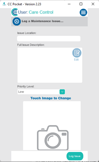 Add the location ie room 1, day room etc, to give the manager and maintenance team as much info as possible, click edit in the full issue description and enter info in the box and save, now prioritise the issue Low, Medium, High, Urgent. If possible and relevant take a photo. Click on the Camera in the box and click take photo this will open the camera for you to take the image. Now that you have completed the form click Log Issue.