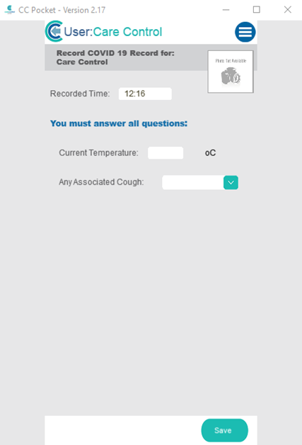 To record your details, click on the Staff COVID Check. Enter your temperature and click on the dropdown to indicate if you have a cough or not, then click Save.
