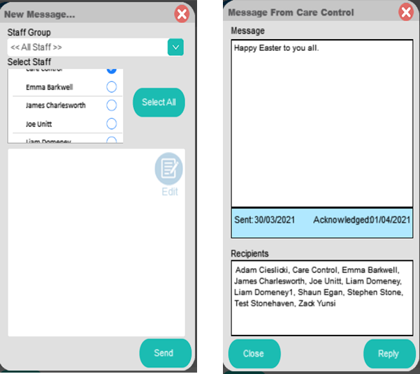 This will allow you to read and reply if necessary. To reply, just click on the Reply button and select the staff you want to include as it will automatically select the sender of the original message. Type in or speak into the phone (if you use the speech to text option) and then click send. The same principle applies if you select New to send an original message.
