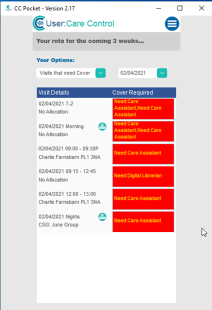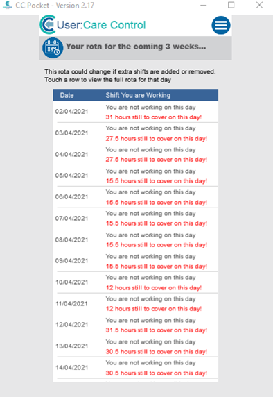 This is your home screen and shows shifts that need to be covered, your messages, your rota, book a holiday, view your timesheet, and other options.