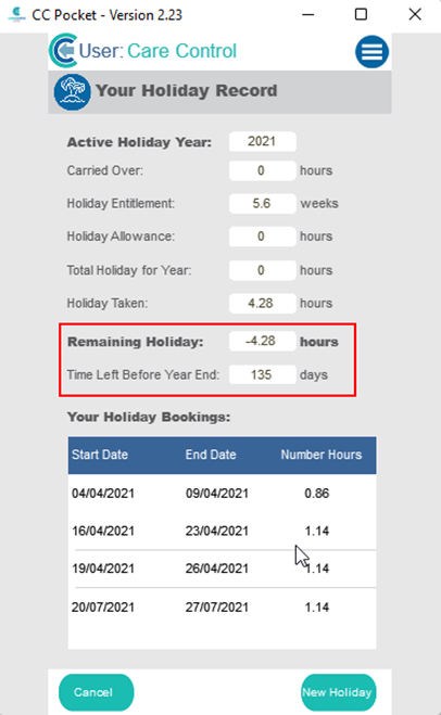 When you click on this button you will see what you have left for the remaining holiday year. To book the holiday, click New Holiday and this will take you to the next screen, however, if you want to go back then click the back arrow at the top of the screen to take you back to the staff home page.