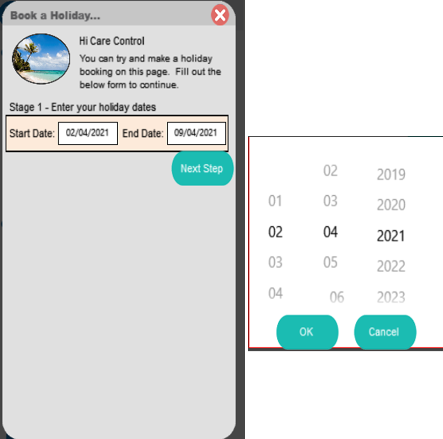 On the next screen enter the start date and end date of your holiday. To change the dates that are automatically displayed click on the date and the screen will change to a numerical rotation screen. In the Date, Month, Year rotations just select the correct dates by changing the numbers and click ok.