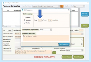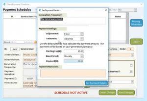 What’s really important if you have social services that pay on a weekly basis or two weekly basis is that you get the correct Generation Frequency. So, if we go in and pick to have a fee schedule running on 2 weekly and say the invoices will be generated on a Sunday in terms of the frequency of payments…