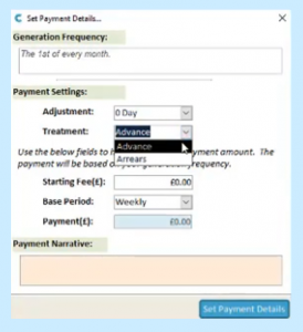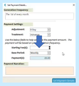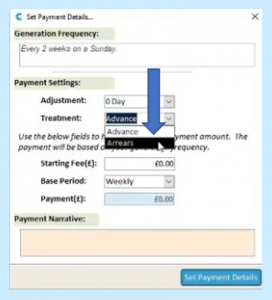 …are they going to pay in Advance, or are they going to pay in Arrears? Now most private fee payers will be paying in advance and I know a lot of local authorities will pay in arrears, so just be watchful of that and make sure you select the right option. We also put in here what the starting fee is…