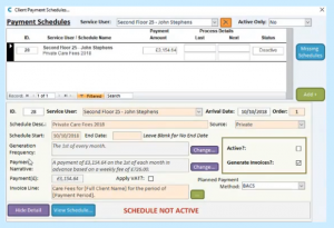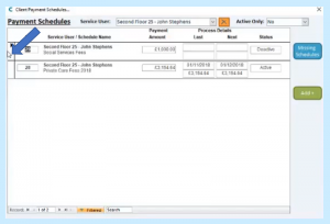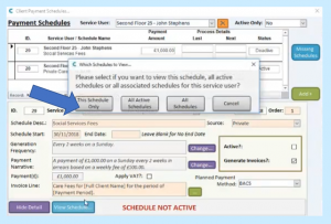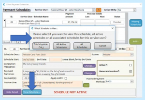…and here you can look at either This Schedule or All Active Schedules. Now, don’t forget you can have more than one Schedule per service user and I know there’s lots of service users out there who may get pension contributions or they may get top-up fees being paid, so you don’t have to have one Schedule, you can have as many as you want per service user that are active. If I look at this particular service user’s schedule that we’ve created…