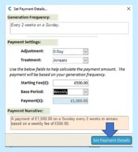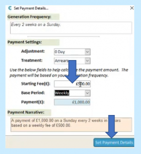 …and it will automatically calculate that if we’re going to pay monthly – which we are in this particular example – that the monthly fee rate is going to be £3,154.64. We can set those payment details in…