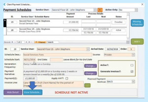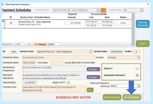 We’ve still got our deactivated one which we haven’t started yet for social services, so we need to forget about that one. But, you can see that we’ve got the Private Care Fees for John Stevens – that’s still active – but we’ve also got a new one that’s been created for John Stephens that’s going to start on 01/01/2019 and you’ll notice that the previous schedule has now got an end date of 31/12/2018, that’s when that schedule will end and then the new schedule will start on 01/01/2019: