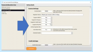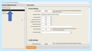 Another area that you want to consider before you start raising invoices is you go into the Finance Settings: